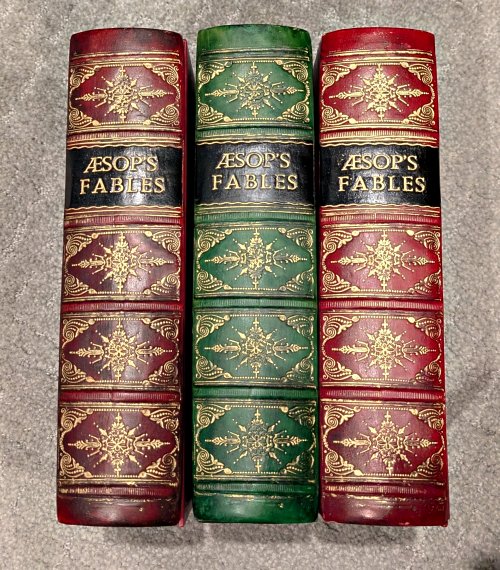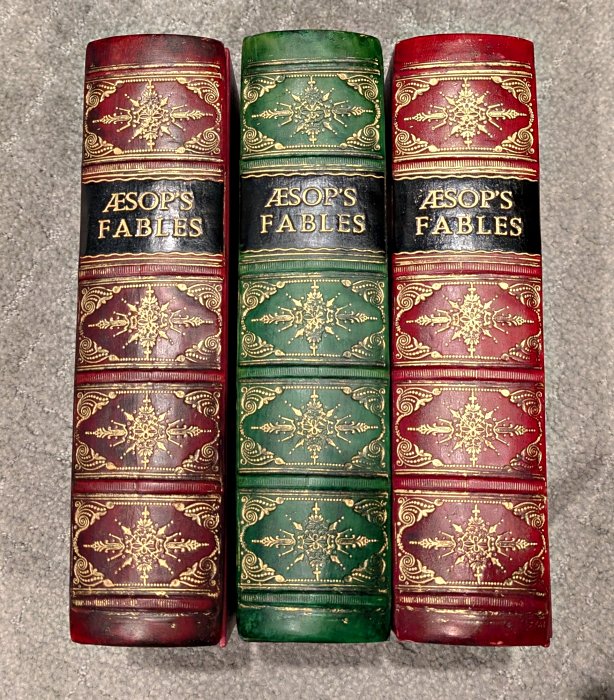 2000? Three safes looking like books of Aesop’s fables. Maroon, Green, Red. 7.5” x 10”. Faux leather and boards. Unknown source.