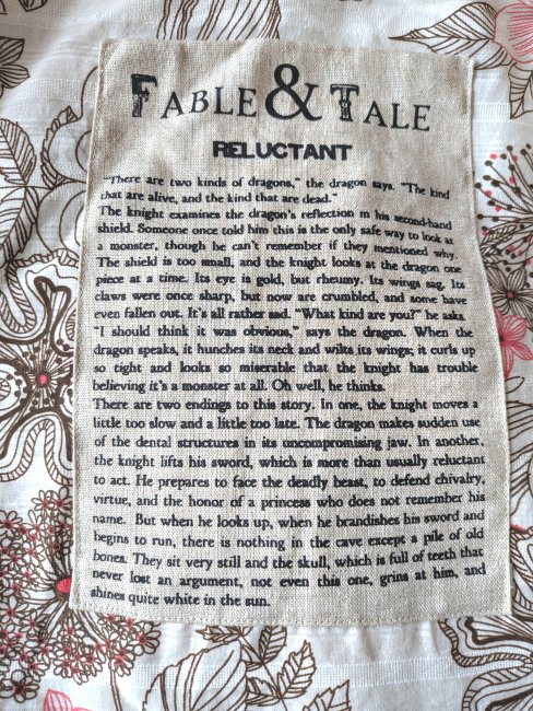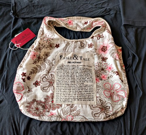 2000? “Reluctant” tote bag. Including the fable “Reluctant.” Fable & Table on Etsy. Printed and sewn by hand. About 17” wide. Bag about 15” high. From Kepler’s Books, Menlo Park, CA.
