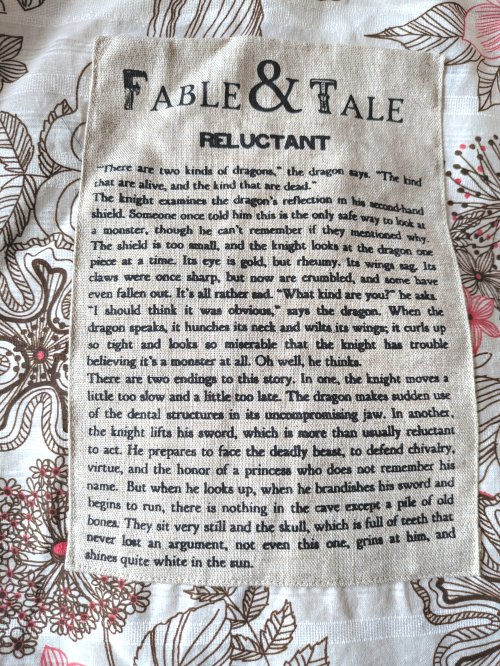 Here is another unusual item, one I include reluctantly. The fable printed on the front of the bag may not be a fable at all. “Fable & Tale” seems no longer to exist on Etsy or anywhere else. It may also be unusual to find Etsy goods in a retail store. The fable invokes “Perseus and Andromeda” without acknowledging it. Cleverer people than I will figure out the conclusion of the “fable.” See the text below.