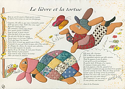 This piece invites, I believe, two particular kinds of fun. First, there are the two main characters, hare with his cap and shorts, and tortoise with her scarf and quilted body. Then there is the little surprise of a similarly multi-fabric butterfly playing with the hare. A fable like this is enchanting