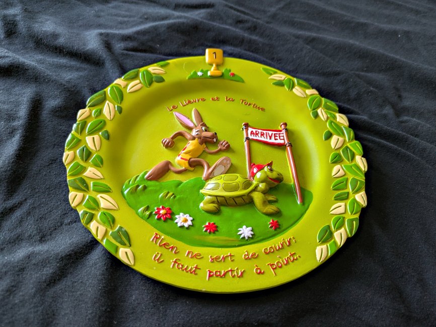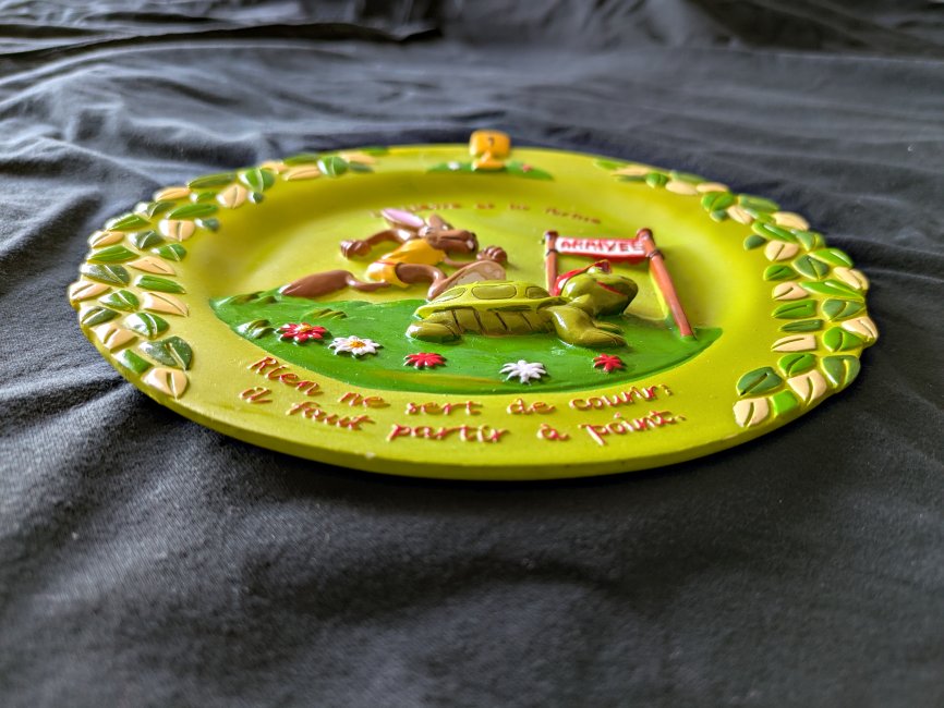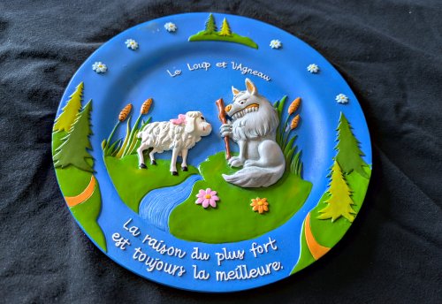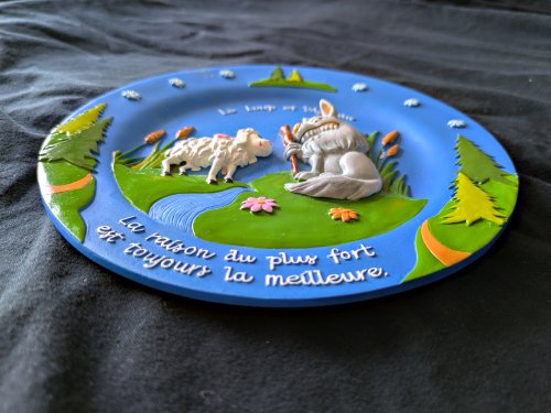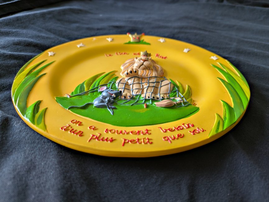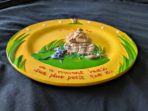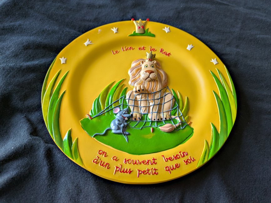 Deep relief scene of the fable, with floral patterns at the sides and a moral below. There is a hook for hanging implanted in the resin back.