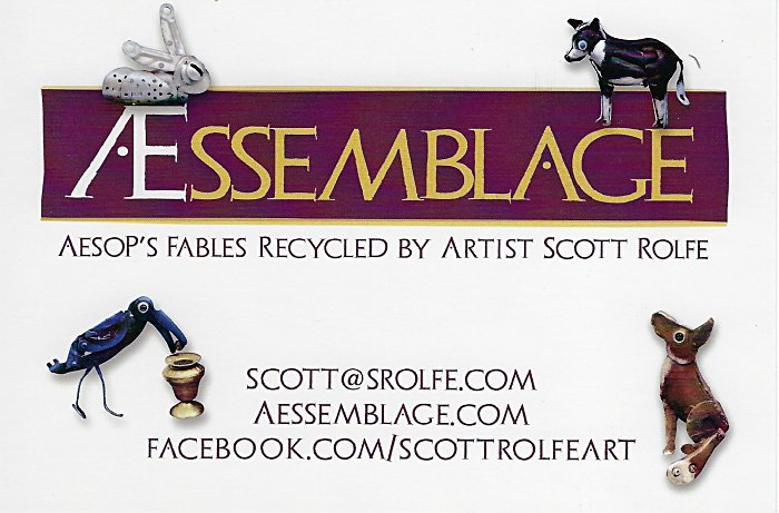 What an explosion of imagination! The book presents twelve assemblages of old tools, parts, kitchen utensils, and sheer junk! The foreword by MC Di Venanzio rightly proclaims of viewing one of these works "This is truly a magical moment." These objects are indeed "something new, yet still recognizable to us all." In the early pages, Rolfe talks about his art and his steps into bringing together his art form and Aesop's fables. For me, the key is the moment when visual art wants and needs story. For Rolfe, it was when a homage to Henri Rousseau "needed something more." "The static lion-in-a-jungle image took on a new dimension, and the experience hooked me on Aesop's Fables" (9). Rolfe creates his own versions of the stories. I notice, for example, that his hare keeps falling back in the race to taunt the slow tortoise. In MSA, not only the donkey but both father and son tumble into the water! LM; DS; "The Rat and the Elephant"; WS; FA; FG; CP; TB; "The Kid and the Wolf"; and FK fill out the fable program. WS and FK are my favorite illustrations. Various pieces seem to be available in various forms, from the original boxes to woodblock replicas.