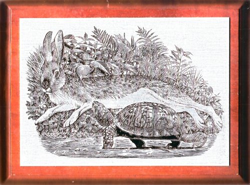 The position of the two heads and the two bodies is well done. The body of the hare half-surrounds that of the tortoise. Is the hare lying still? The tortoise is certainly not! The tortoise looks up at the hard. Is that a surprised look by the hare? A wary one? Well done!