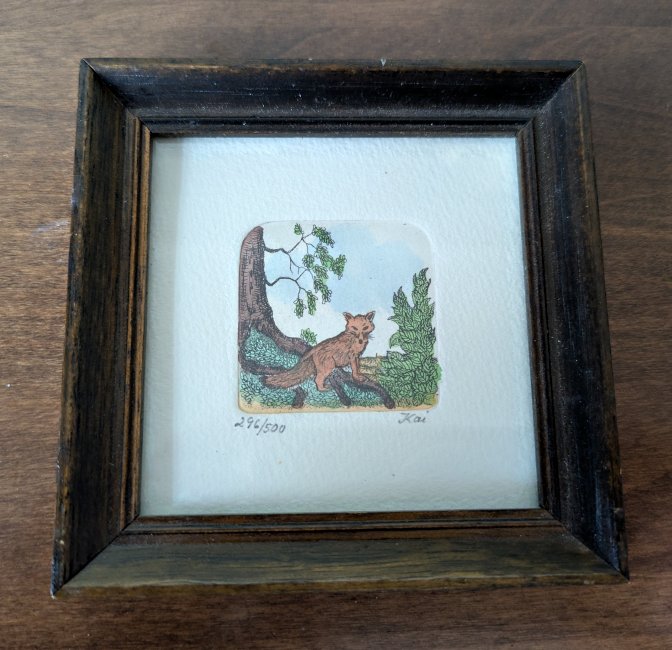 Beautiful, delicate work! The image is about 1.5" square. This fox seems quite self-possessed. And those grapes seem so close! Is this the same Kai that is on Etsy and Markowicz these days? I am disappointed that, although there were 500 copies of this work, none of the others show up on the web.