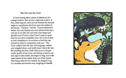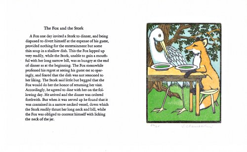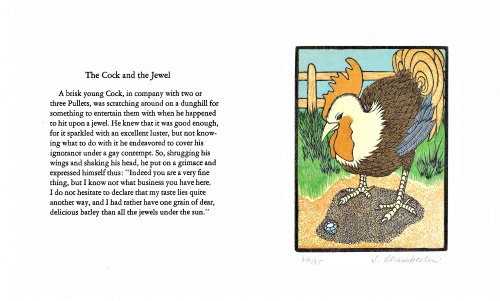 1984? Ten original prints with text by Sarah Chamberlain. Each signed and numbered 26 of 35. $160 from the artist, Oct., '89. Fables: "The Ass in a Lion's Skin"; FS; FK; LM; FC; "The Cock and the Jewel"; GGE; FG; TH, CP.