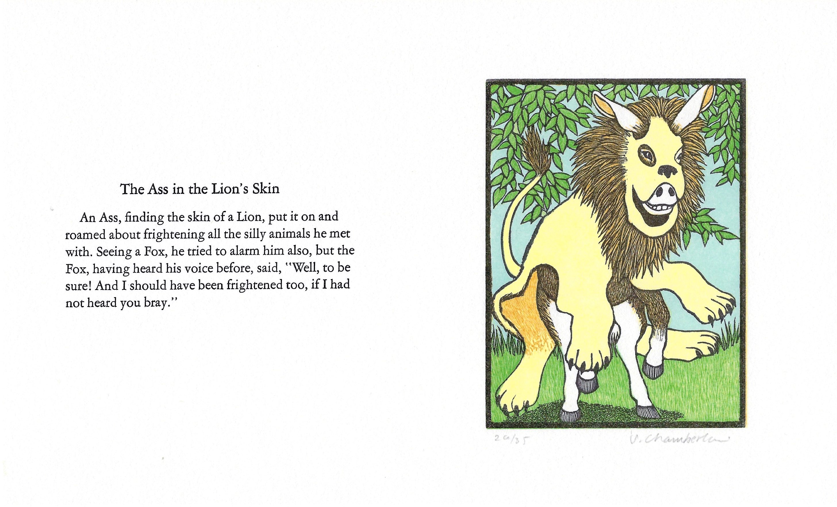 Beautiful multi-colored work. The best of the set are "The Ass in a Lion's Skin," FK, and LM. A lovely treasure. See now the book of these prints which Ms. Chamberlain published in 1984.