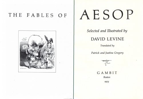 1975 Galleys of “The Fables of Aesop, Selected and Illustrated by David Levine.” Translated by Patrick and Justina Gregory. Boston: Gambit. $60 from Marc J. Bartolucci through AbeBooks, Nov., ’25.