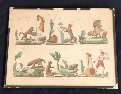 1870? Framed broadside presenting six colored fable scenes. 13" x 9½". Framed by worn tape. Chez Jean, Rue St. Jean de Beauvais #10. No. 33. €10 from guymarie justin through Ebay, April, '22.