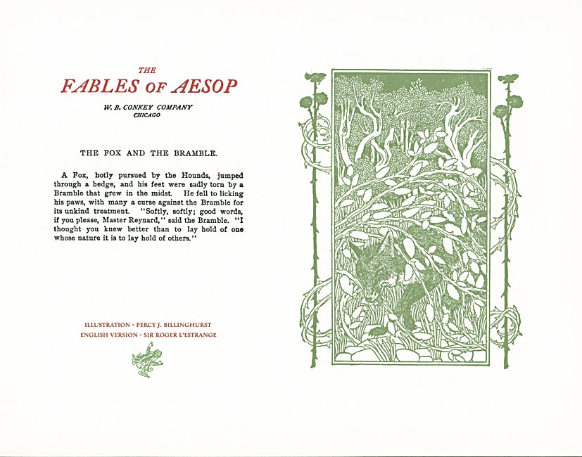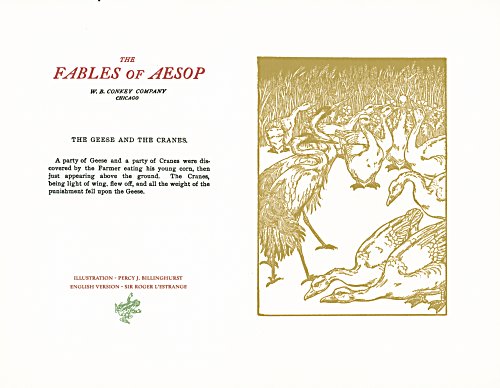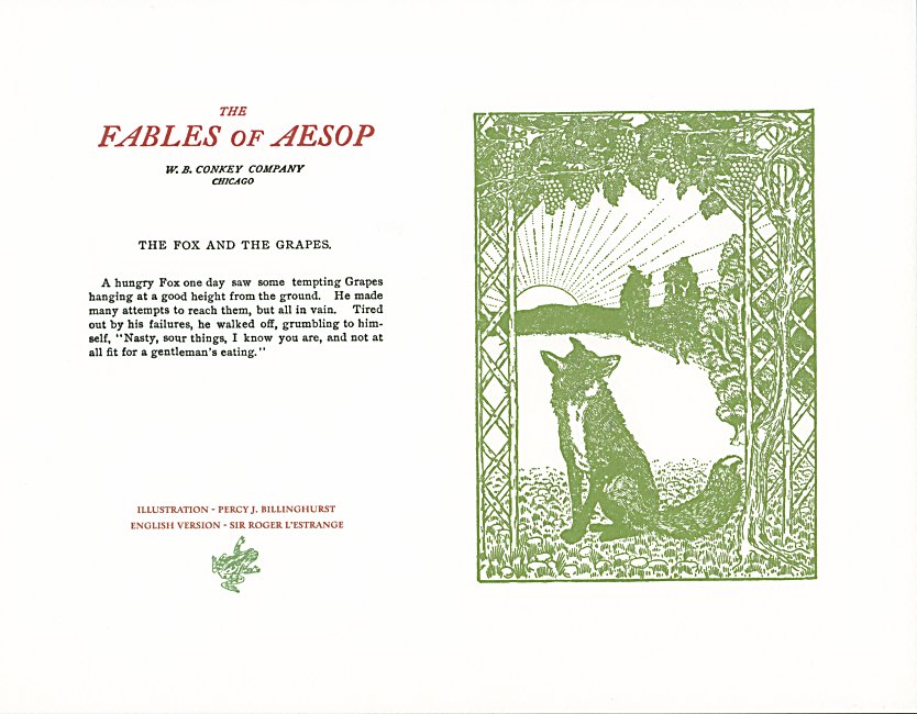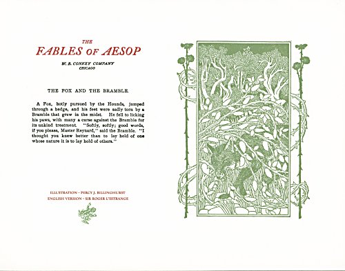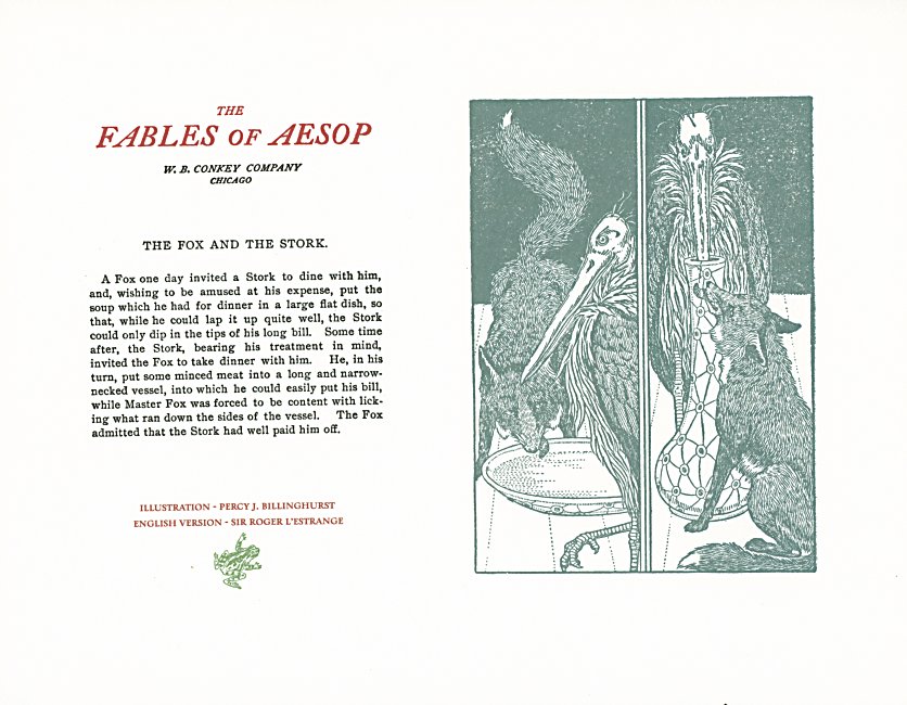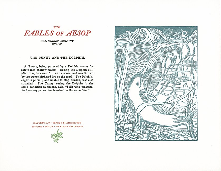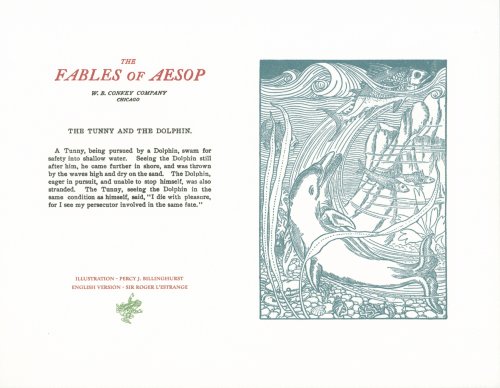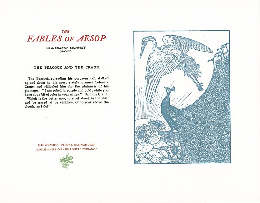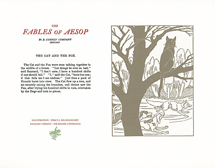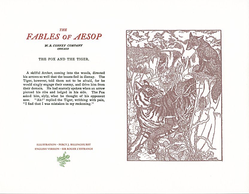 These are attractive broadsides, nicely printed. Strong work with various colored inks. There are two striking anomalies. One is that the standard J.B. Rundell texts used regularly in Conkey editions of Aesop are used here but labeled as coming from "L'Estrange." The other anomaly was already present in the early Conkey editions: Billnghurst did these illustrations for La Fontaine's fables.