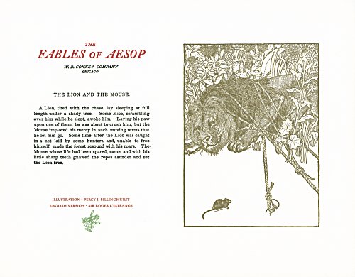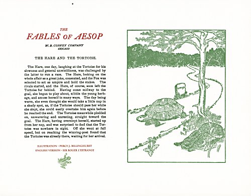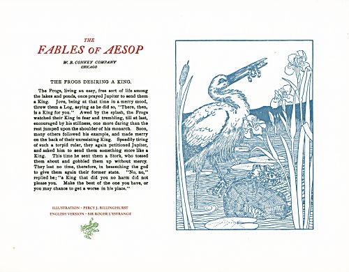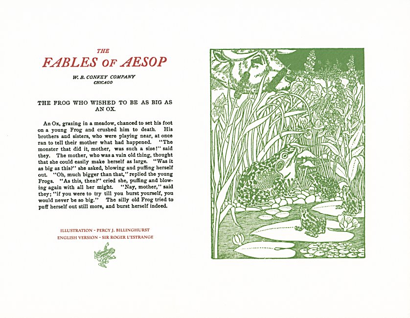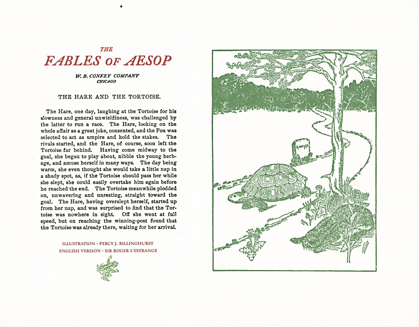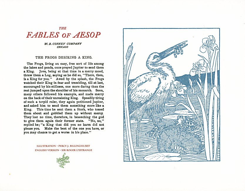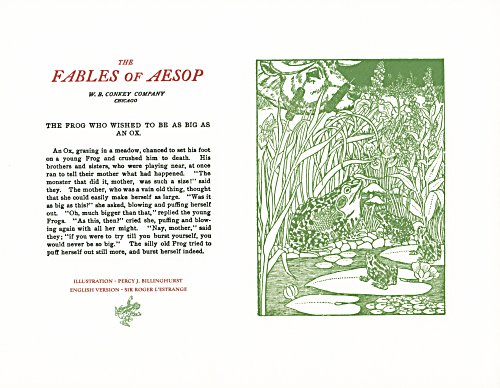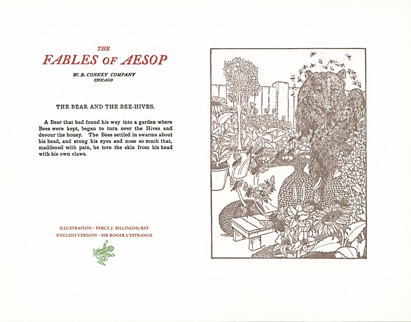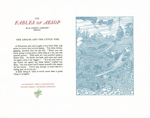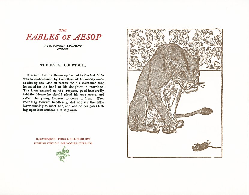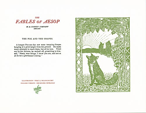 These are attractive broadsides, nicely printed. Strong work with various colored inks. There are two striking anomalies. One is that the standard J.B. Rundell texts used regularly in Conkey editions of Aesop are used here but labeled as coming from "L'Estrange." The other anomaly was already present in the early Conkey editions: Billnghurst did these illustrations for La Fontaine's fables.