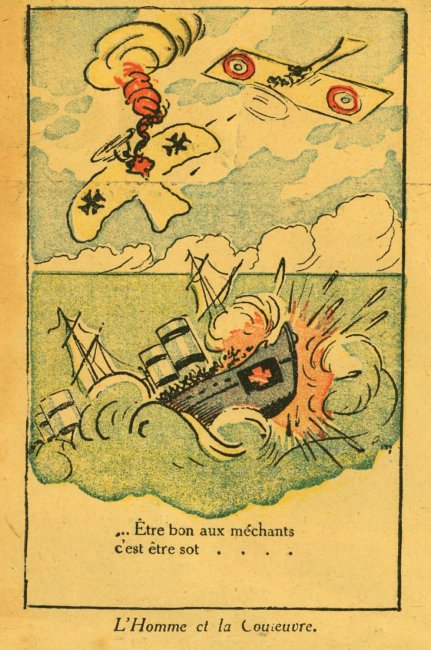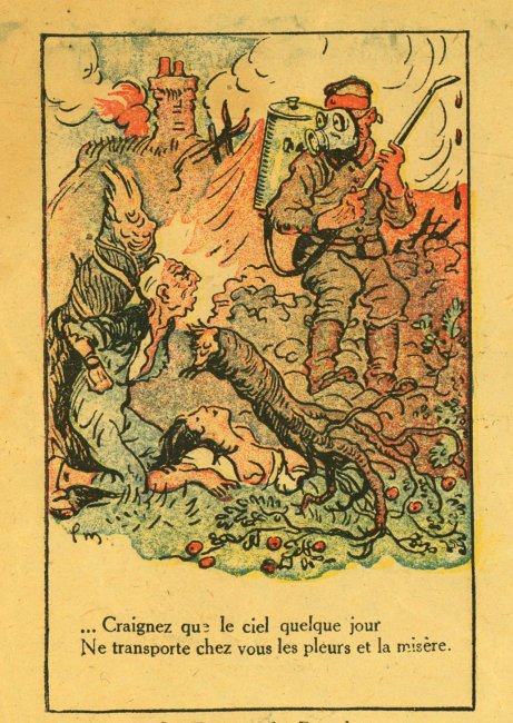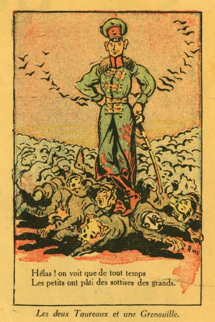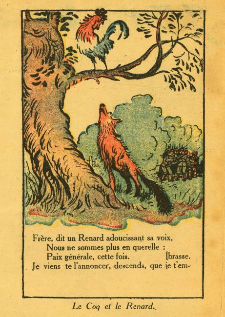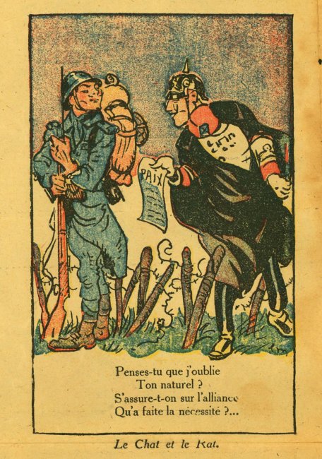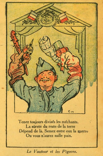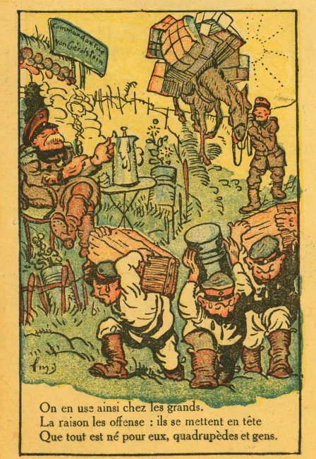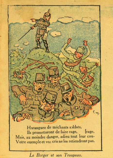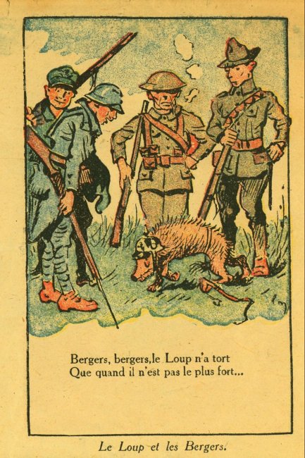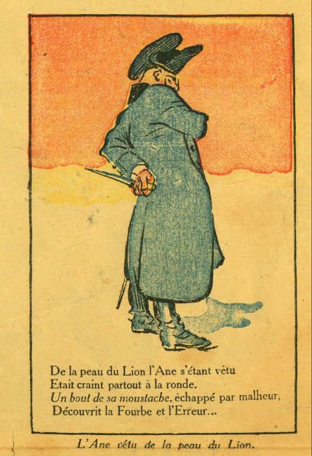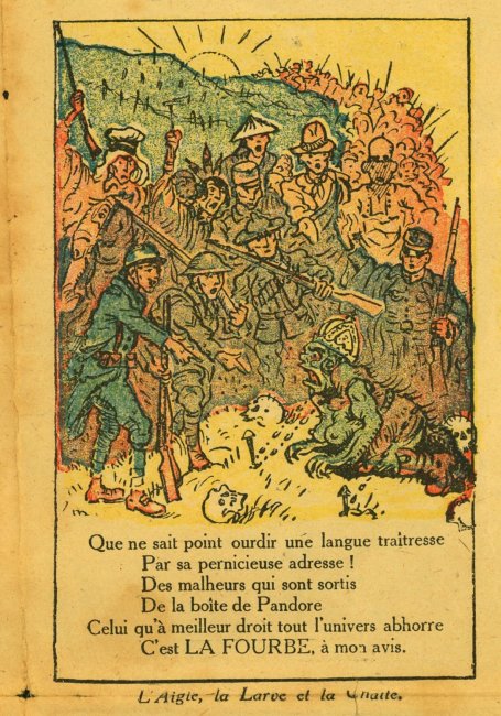 A fascinating piece of work with verses taken or adapted from La Fontaine's fables and applied to the Germans in WWI. I can find another product of "Imprimerie de Montsouris P. Orsoni" on the web, dated 1916. The imagery here is sometimes rough but thoroughly challenging!