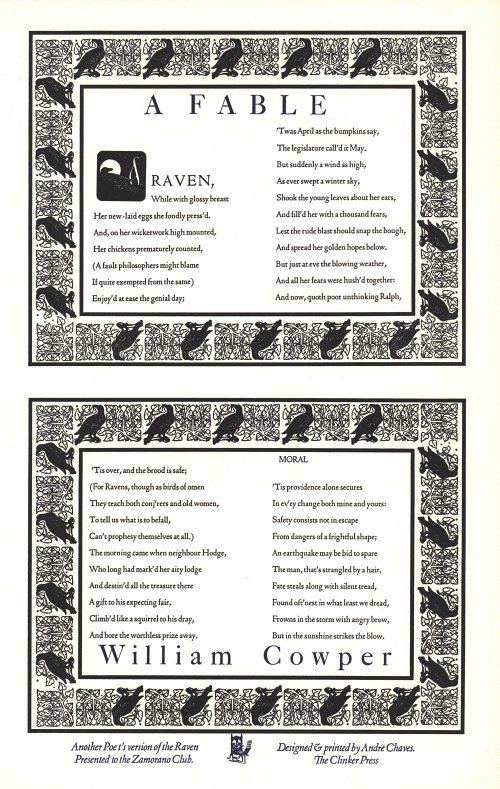 In 2011 Chaves at the Clinker Press produced a version of Edgar Allen Poe's "The Raven." Might this broadside of Cowper's poem have been a companion piece? Dramatic work on a poem surrounded by a repeated printer's design involving a raven. The fable is about a mother raven who fears for her newly laid eggs in the storm and is then relieved -- only to have "neighbour Hodge" come the next morning to steal the eggs to give to his girlfriend. "Fate steals along with silent tread, found oft'nest in what least we dread."