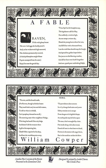 2011? "A Fable," broadside designed and printed by hand on handmade paper by André Chaves. "Another Poet's version of The Raven presented to the Zamorano Club." Clinker Press. 10¼" x 16". $80 from Oak Knoll Books, Oct., '21.