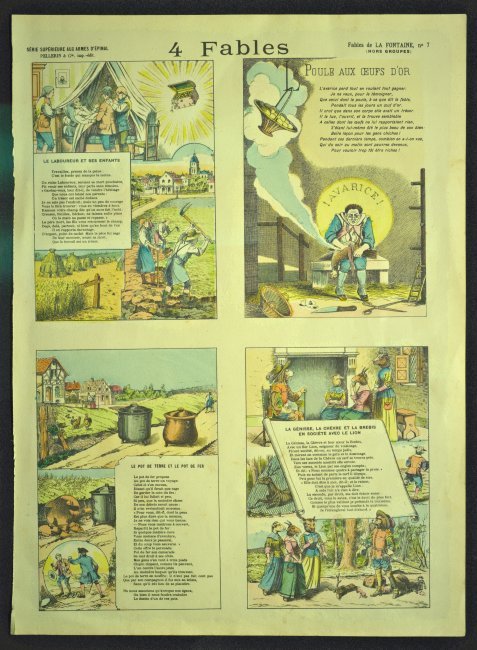 1890? Twenty-three printed sheets, 12½" x 16¼", each featuring either an individual fable of La Fontaine or a set of four fables. Each is numbered in an apparent set of 25. Now I have found the whole set of 25 gathered in a book, Fables de la Fontaine, for which I have guessed a date of the same year. Matted on white cardboard. Missing are #3, #7, and #20. There is one extra copy of #14. Each is marked "Série Supérieure aux Armes d'Épinal, Pellerin & Cie, imp. -édit." and "Fables de LA FONTAINE (Hors Groupes)." I bought 21 of them as a group from a Buchinist along the Seine, August, '99; individually they were priced between 70 and 120 Francs each, but we settled on a group price of 1150 Francs for the twenty-one. I found two others at another Buchinist stall just a few minutes later and paid 75 Francs each for them. Epinal 1895 Number 7 for 40 Euros from a bouquinist, June, 2025. Click on any image to see it enlarged.