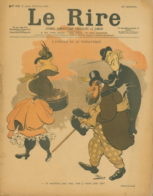 1899 "L'Aveugle et le Paralytique." Dessin de Doës. Front cover. Le Rire No. 225, February 25, 1899. 9" x 12". €10 at Clignancourt, July, '19. Extra copy for €15 from a bouquinist, Paris, July, '23.