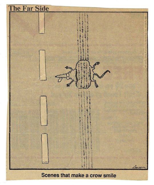 1993 Far Side Cartoon “Scenes that make a crow smile.” Gary Larson. FarWorks. Universal Press Syndicate. Unknown source.