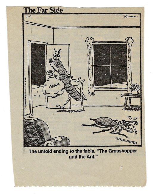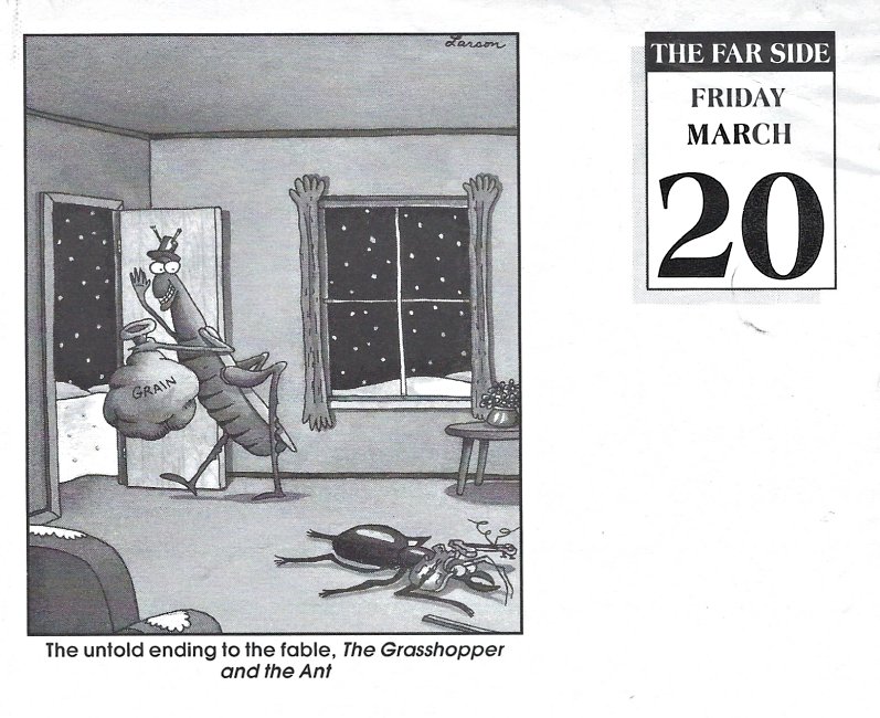 1999? Far Side Cartoon Featuring the Grasshopper and Ant.” Gary Larson. Calendar for Friday, March 20, 1999? Unknown source.