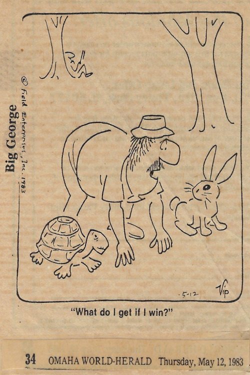 1983 Big George. TH cartoon. "What do I get if I win?" asks a man at a starting line between tortoise and hare. Signed "Vip" and dated 5-12. Appeared in the Omaha World-Herald of Thursday, May 12, 1983. Copyright 1983 Field Enterprises, Inc.