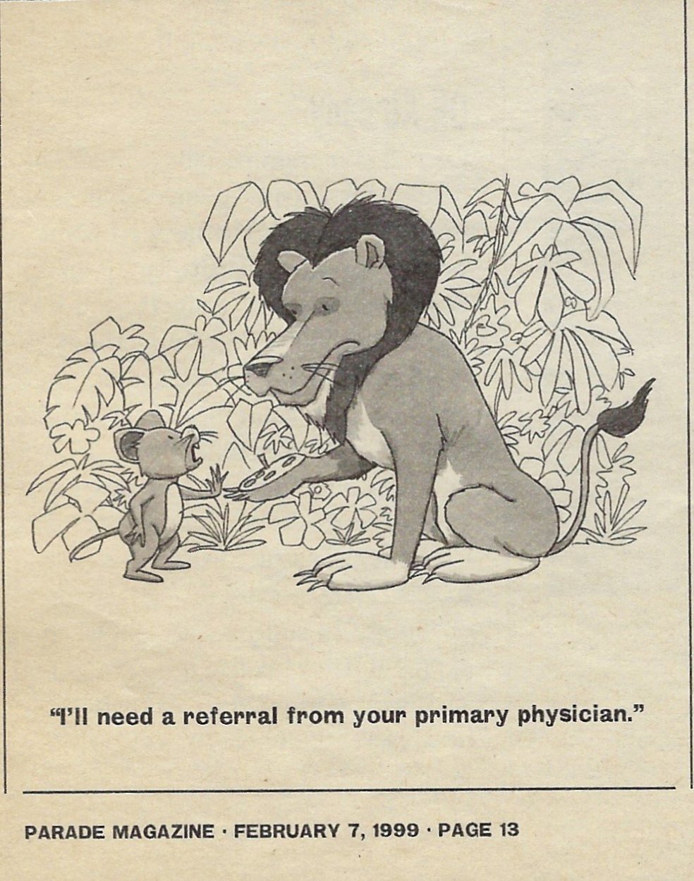 1999 “I’ll need a referral from your primary physician.” Unnamed artist. Parade Magazine. Feb. ‘7, 1999. Unknown source.