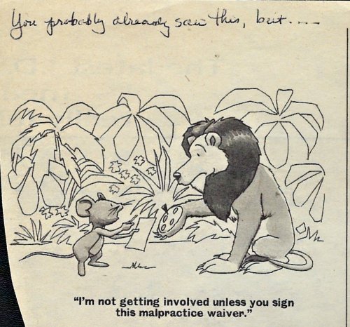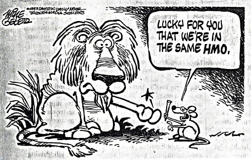 The conversion to HMO organization for health care of the USA leads to this humorous application to the story – a fable story I think I do not yet understand – about a mouse taking a thorn out of a lion’s paw.