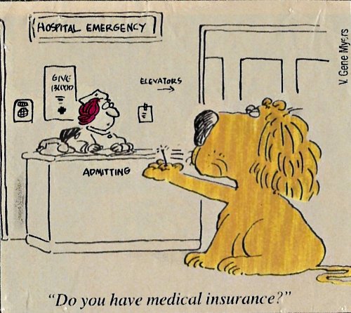 A lion with a thorn in his paw is at the admitting desk of a hospital emergency room. A nurse, seated behind the desk, asks the all-too-common question, "Do you have medical insurance?" V. Gene Myers is known for his gag cartoons, which have appeared in publications such as Playboy and Good Housekeeping.