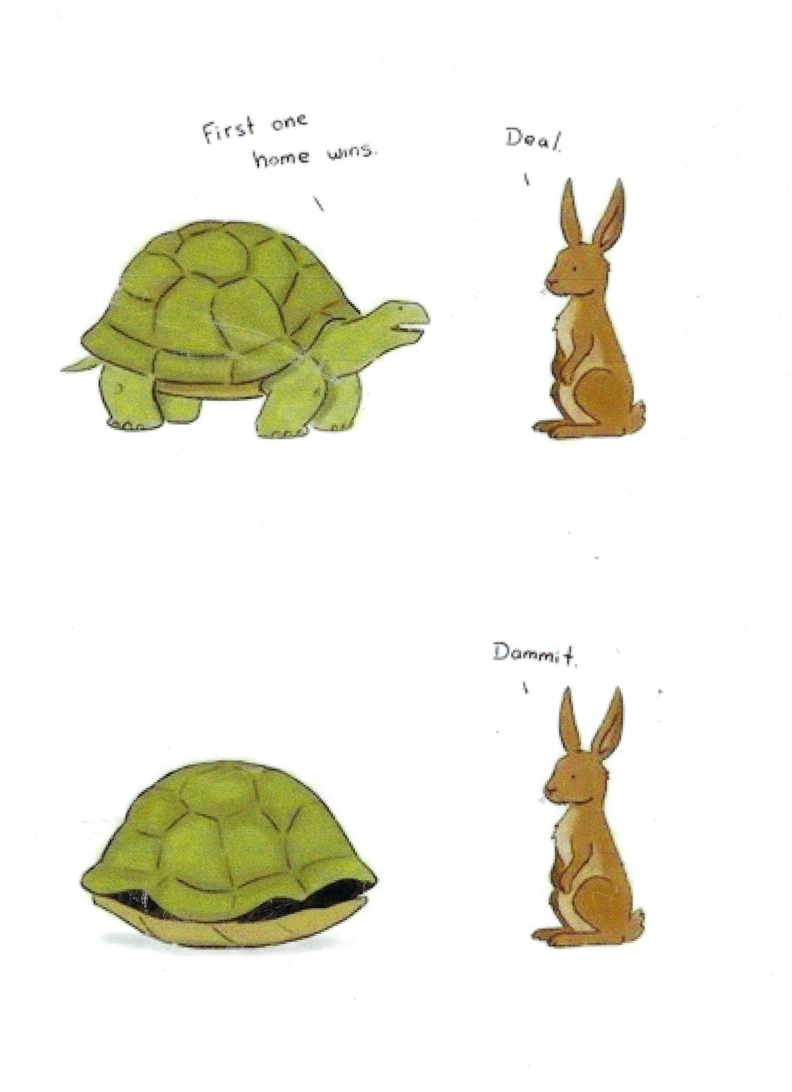 The hare is drinking, perhaps to deal with his shameful loss in the race. Now comes the news that the tortoise raced illegally. Cleverly done!