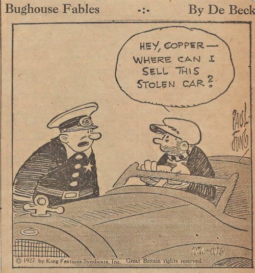 I learned in researching these cartoons that “bughouse” means “crazy.” Billy De Beck was the creator of Barney Google. This is a typical case of “fable” not referring to the sort of thing associated with the name of Aesop. Since I have come across them, I preserve them here. The basic movement of these cartoons is role reversal, as when a criminal asks a police officer where he can best sell a used car. In the simplest and last of these, a child in his crib smokes a cigar. Fun still 98 years later.