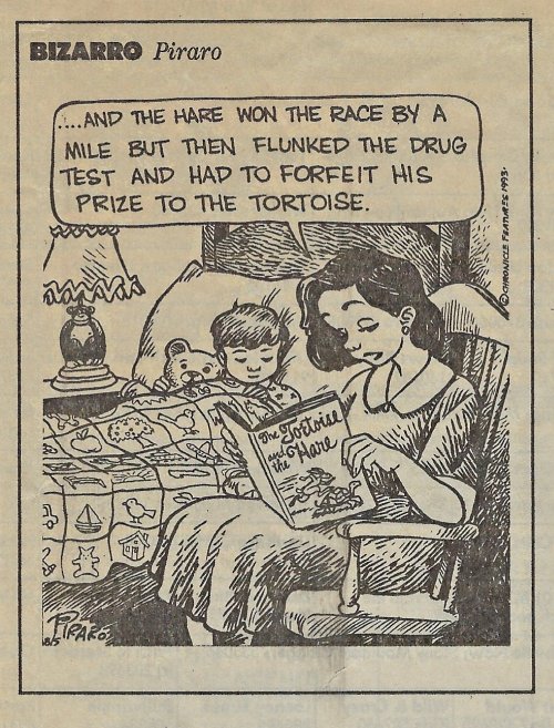 Since the advent of drug testing of athletes, humorous versions of the standard American fable of the race between tortoise and hare has frequently engaged that new element.