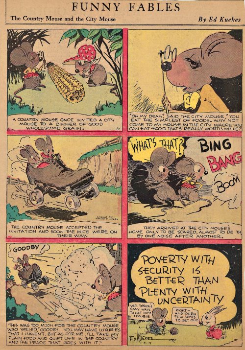 Now here is a bargain! I had known of Kuekes’ work through cheap black-and-white reprints. This set is so much better! As I noted then, Kuekes is absolutely faithful to the traditional fables. Each strip has a last frame with a moral; the action of the rabbit and mouse there may or may not relate directly to the fable and its moral.