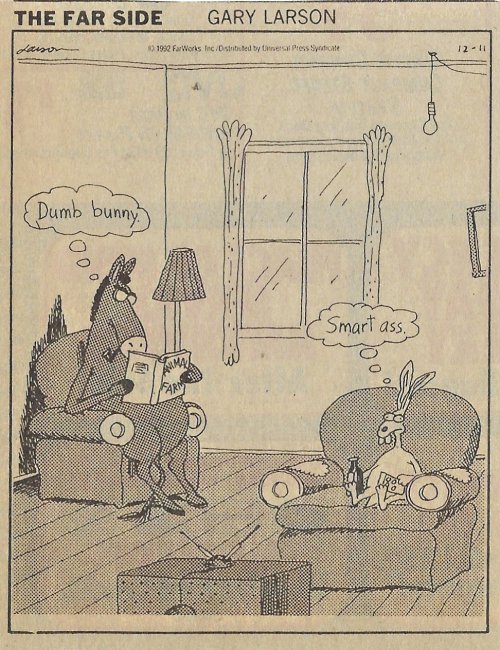 1993 Far Side Cartoon “Dumb Bunny Smart Ass.” Gary Larson. FarWorks. Universal Press Syndicate. Unknown source.