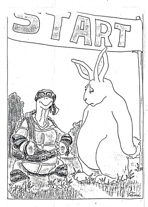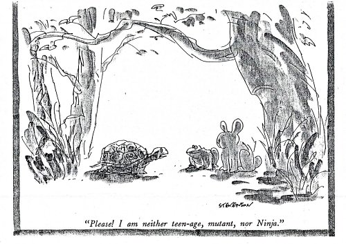 Popular culture became so fascinated by teen-age Ninja mutant turtles that Stevenson suggests the old fable and has the turtle disclaiming that default modifier for any turtle.