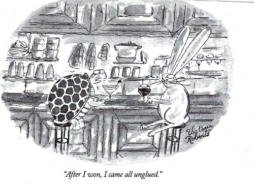 By contrast with a New Yorker cover a year later, this tortoise is a Ninja! And it takes the poor hare completely by surprise. Since he is a Ninja, he appears to be supremely confident. Sometimes there is a reason why fables turn out in the their own surprising fashion!