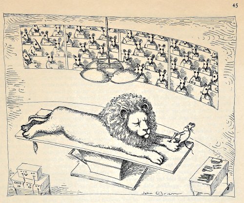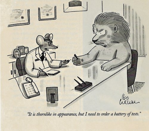This play on the mouse removing the thorn from the lion’s paw mocks modern medicine’s endless need for confirming tests. I still wonder where this particular story arose.