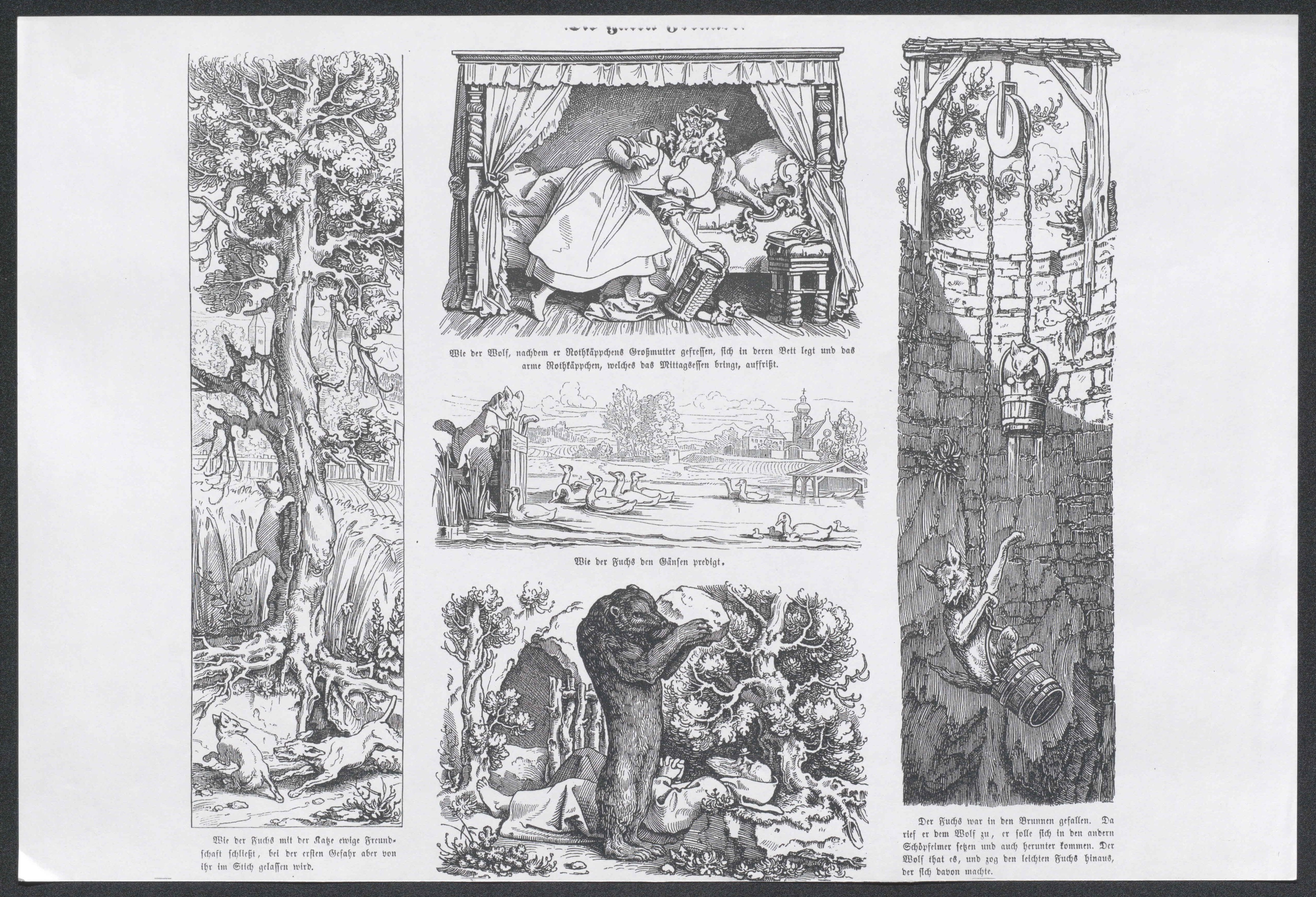 Copy of illustrations from several works. Three fables are pictured on the left (“The Cat and the Fox”), the bottom (“The Bear and the Gardener”), and the right (“The Fox and the Wolf in the Well”). “Little Red Riding Hood” is at the top center, with the fox preaching to the geese below that.