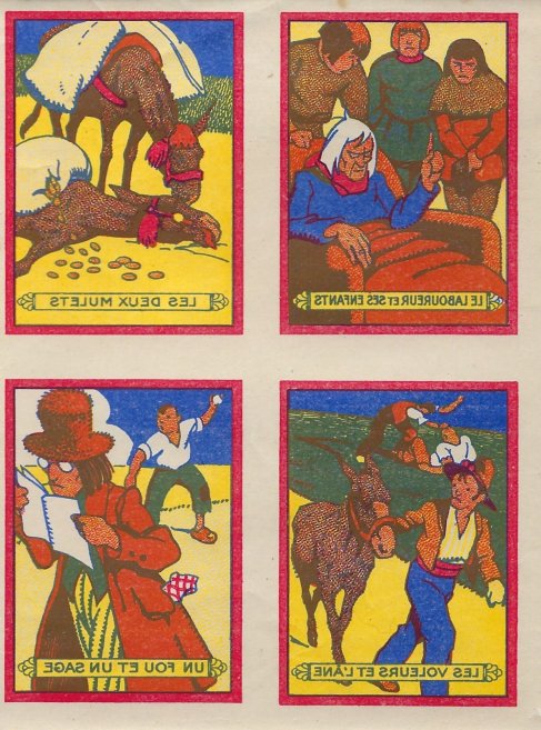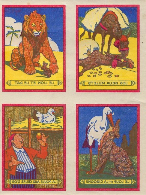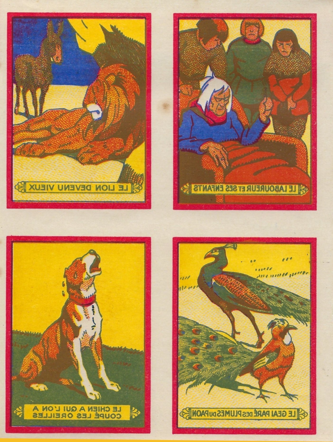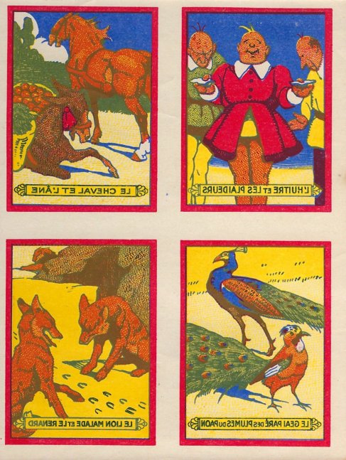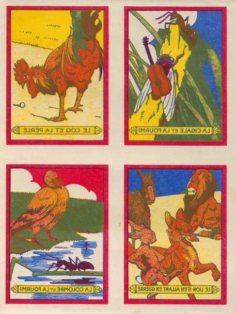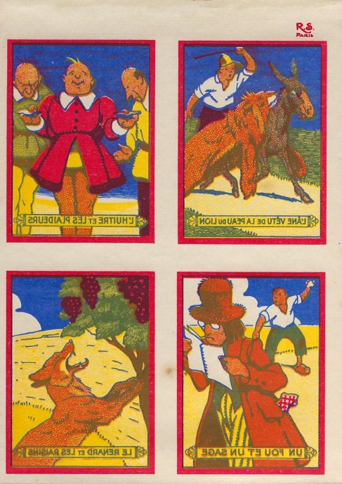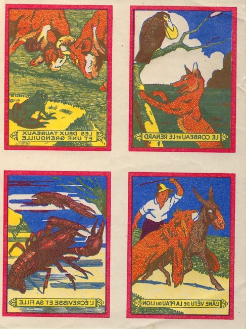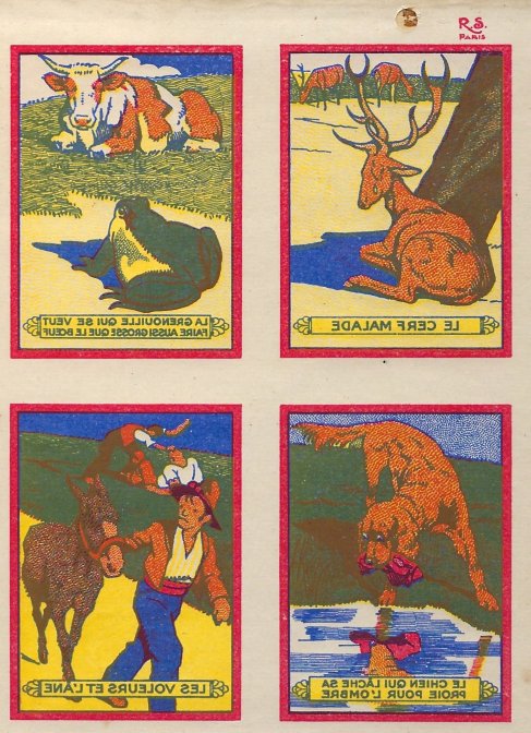 1950? "les belles décalcomanies," two sets, each with 16 "transfer pictures" of La Fontaine's fables. R.S. Paris. €6 each from labuandrie, through Ebay, Oct., '23.