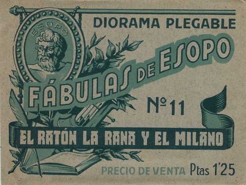 These strange and delicate creations witness to the range of places in which Aesop shows up. In each "diorama plegable," stiff paper is cleverly folded and pasted so that the result is a folded-over scene with two layers on its lower fold. One of these lower layers is a floor with openings, and the other below includes persons and items that emerge through the openings. As an onlooker lifts up the top fold, the characters lying flat on the upper bottom fold rise up and thus give the scene a third dimension. The workings are fragile, and few of the characters still stand up well. "La Zorra y los Cazadores" is in perhaps the best condition of the group. The fable's text and moral are given on the bottom of the lower fold, and on the top of the upper fold is a list of published and to-be-published dioramas. Notice that none of ours come from the promised group between "20 and 27." Did it ever appear? The ten we have are: