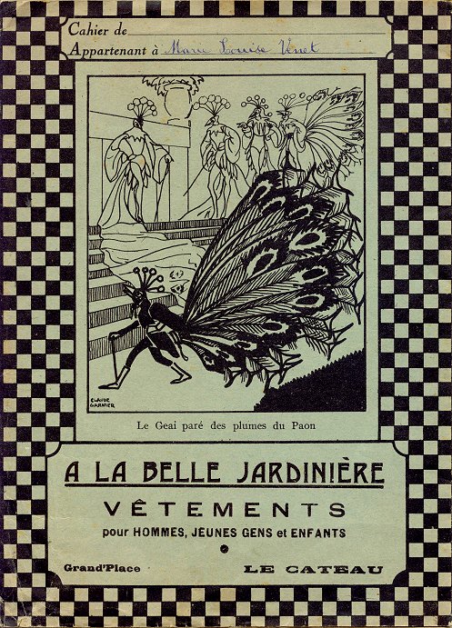 This "protege-cahier" pictures the jay at a peacocks' ball or court. Like the other dust-jacket sent by Mimi, it has a checkerboard background. The back cover offers the text of La Fontaine's fable under addition and multiplication tables. Mimi mentioned to me that this, along with the accompanying FC dust-jacket, belonged to her mother in 1934. The inside has simple 6" fold-in flaps with more advertising. Like the cover, the advertising here also mentions "Grand' Place, Le Cateau."