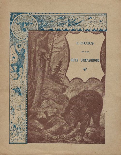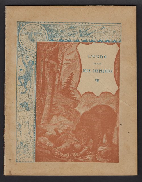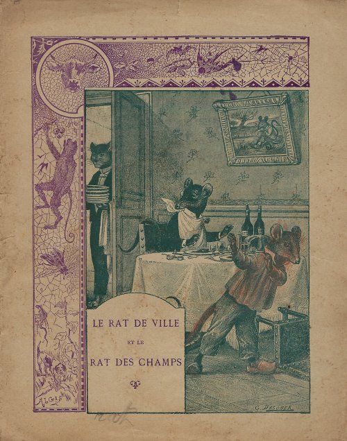 Fragile and beautiful old book covers, different in style from many that come later. A monochrome fable illustration with an open space for a title is set inside a large monochrome border at the left and top. This border is uniform in these four exemplars, though its color varies. It is signed by “Algis,” as is the monochrome inset of WC. TMCM and “Wolf Become Shepherd” are signed by “G. Dascher.” “C. Charier” seems to be the publisher. One can find other cards or illustrations by Charier on the web. Many seem to be about WWI. Neither Algis nor Dascher shows up in our collection otherwise. Someone seems to have colored portions of the fleeing mouse in TMCM.