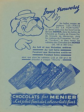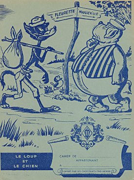 1950? School dust jacket "Le Loup et le Chien" offert par les Chocolats Fins Menier. Imp. Typo Noisiel. About 7" x 9˝". €1 from French Vintage Shop, Paris, through eBay, Feb., '13.