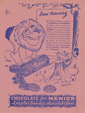 1950? School dust jacket "Le Lion et le Moucheron" offert par les Chocolats Fins Menier. Imp. Typo Noisiel. About 7" x 9˝". €1 from French Vintage Shop, Paris, through eBay, Feb., '13.