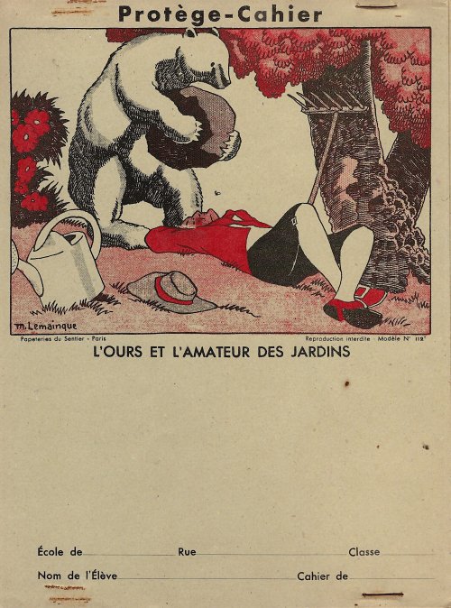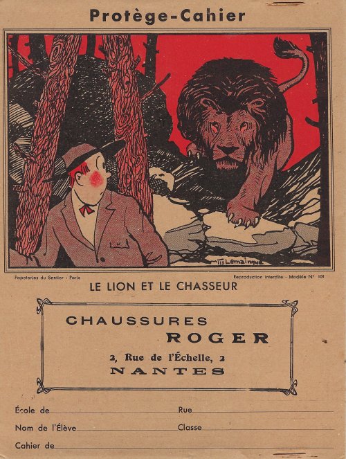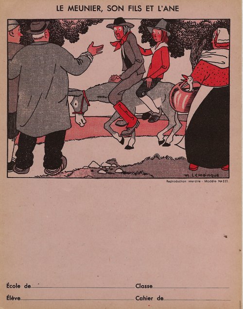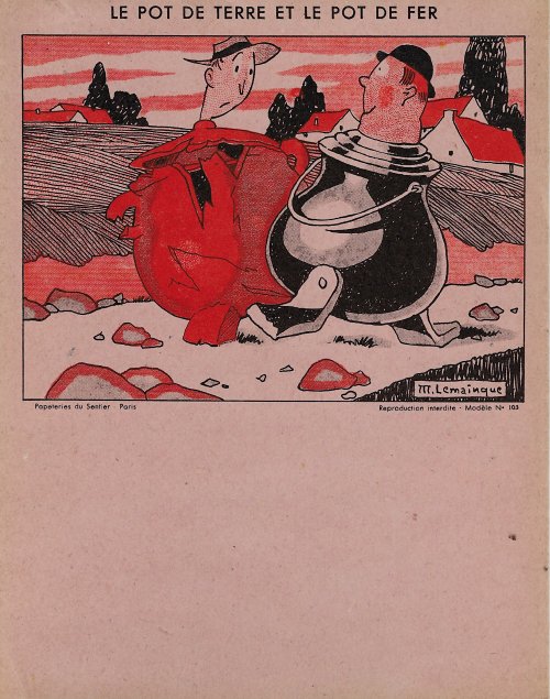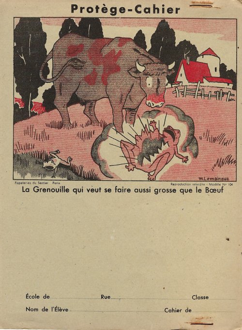 1935? Five dust-jackets, each with a duochrome illustration of a La Fontaine fable by Maurice LeMainque (1893-1942). 7" x 9˝" overall, with illustrations 6⅜" x 4⅝". Papeteries du Sentier. €5 each from kam-oulox through Ebay, Nov., '22.