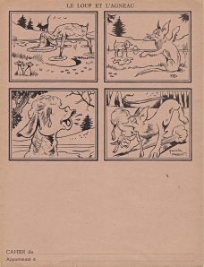1950? Three French dust-jackets, 9˝" x 7", apparently for a school book, with art signed by Maurice Parent. One advertises "Costes, 36 et 38, Boulevard Richard-Wallace, Puteaux." 25 Francs from Annick Tilly at the Clignancourt flea market, August, '99. The other two lack advertising and present WL, one on green and one on red paper stock. Each for $5 from Mme Denise Debuigne, Rennes, France, Feb., '05.