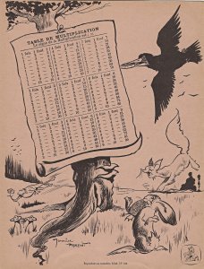 These dust-jackets are unusual in providing oversized flaps on both sides of the inside, one offering the text of the fable and the other a bust-portrait of and a few lines about Jean de La Fontaine. On the cover of the FS exemplar there is an invitation: "Dear Children" should tell their parents for Christmas to address themselves to Costes. The back covers show a multiplication table nailed to a tree. Around it a crow flies with cheese in its mouth, while a fox runs up underneath. In the foreground are a tortoise and a hare.It is possible that the artist is Maurice Parenti, with the letter " i" on the end of his name.