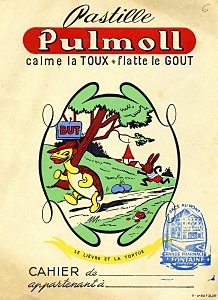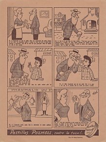 Pulmoll is here using the same catch-phrase as on the dust-jackets from a different era. The side flaps still present districts of France. The cartoon on the back cover seems to say that Grandpa gets over the cough from smoking cigars by taking Pulmoll tablets.