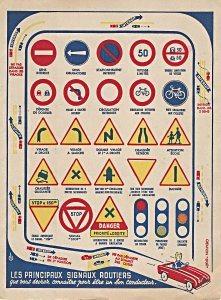 The title continues "calme la Toux * flatte le Gout" (perhaps "calms the cough, soothes the taste"?) Two marked "Face au Pont Grand Pharmacie. J. Fontaine. Compiegne." Highly colorful cartoons of TH, GA, and TMCM grace the covers of these three dust jackets. The back cover has basic road signs. Inside on the flaps are lists of districts of France.