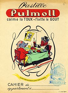1940? Three French dust-jackets, 9˝" x 7", apparently for a school book, advertising "Pastille Pulmoll" €6 each at St. Ouen, August, '13. One duplicate of TH without the "Grande Pharmacie La Fontaine" stamp on the cover for $5 from Mme Denise Debuigne, Rennes, France, Feb., '05.