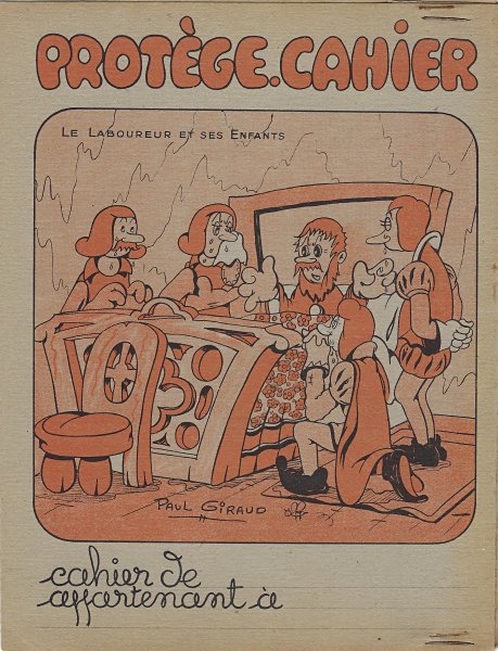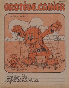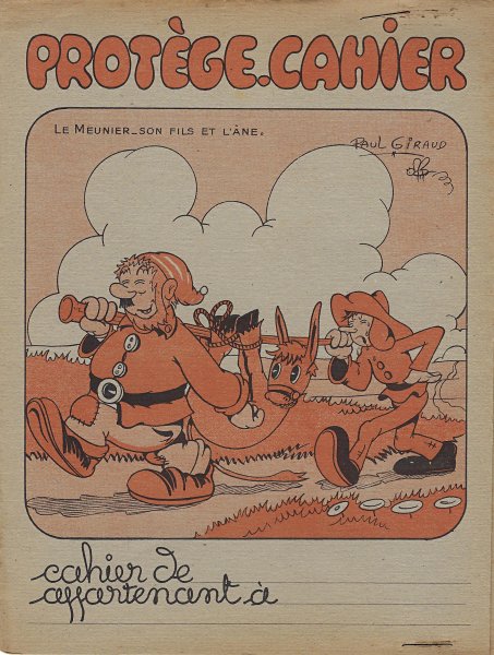 1915? Three dust-jackets, each with an orange duochrome illustration of a La Fontaine fable signed by Paul Giraud. The verso offers tables of addition, subtraction, multiplication, and division. The stapled inside flaps offer the outline of a weekly work plan and a centimeter ruler, respectively. $5 apiece from Mme Denise Debuigne, Rennes, France, Feb., '05. Extra copy for $6 of LM from Bertrand Cocq, Calonne-Ricouart, France, Sept., '21.