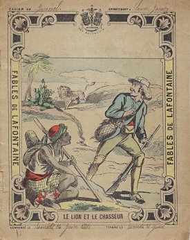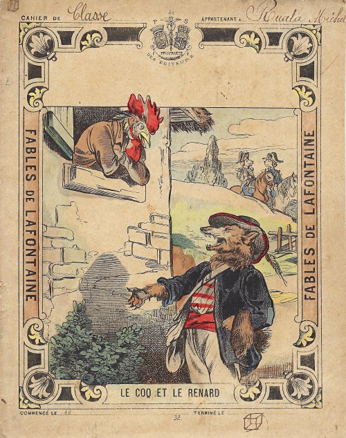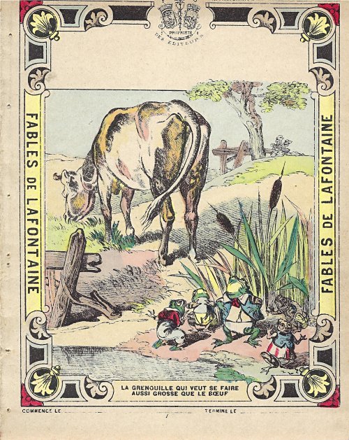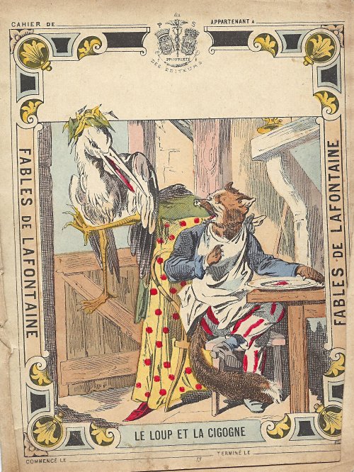 1900? 4 Dust jackets ("Couverture Cahier") "Fables de La Fontaine" featuring colored work presentations of individual fables and texts on the back covers. Perhaps all from Pellerin of Épinal? €6 each from Chromosetcollections on Ebay, Nov., '20.