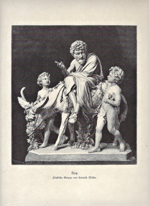 1900? Copy of a 19th-century line engraving of Aesop with two younger figures. Sculpture by Karl Heinrich Möller, who died in 1882. Image 7" x 8". Page 10.2" x 13.8". Unknown source.