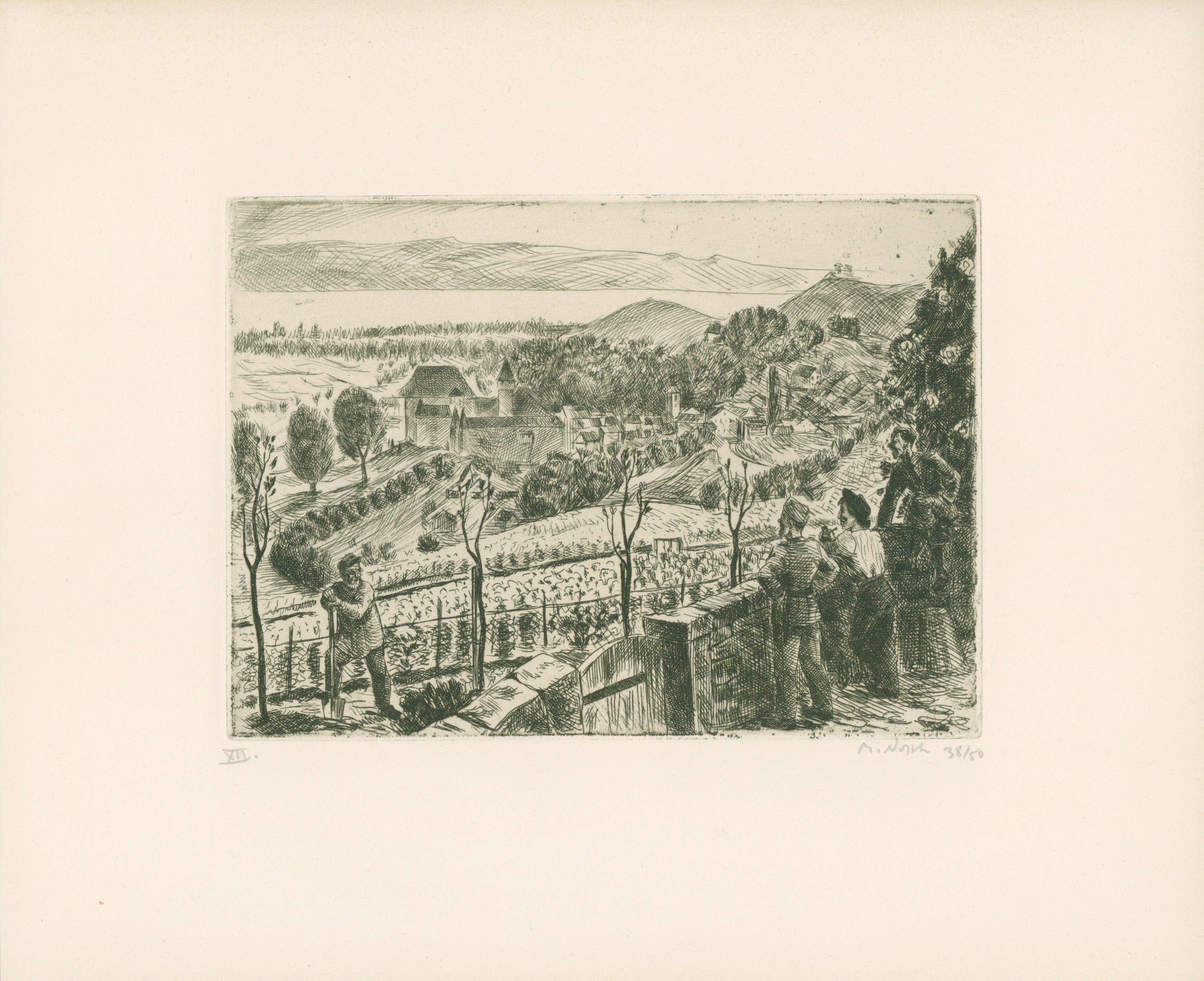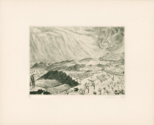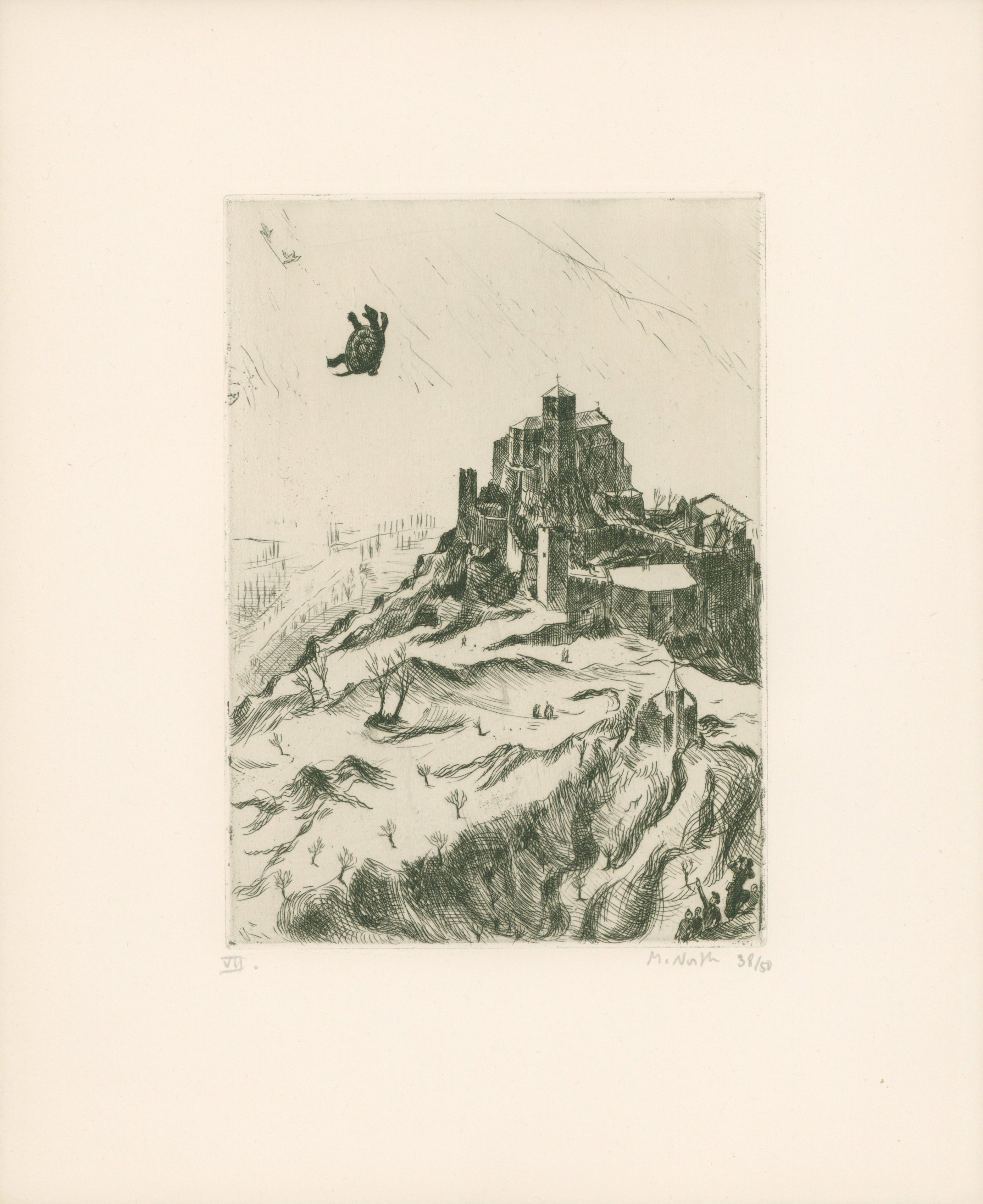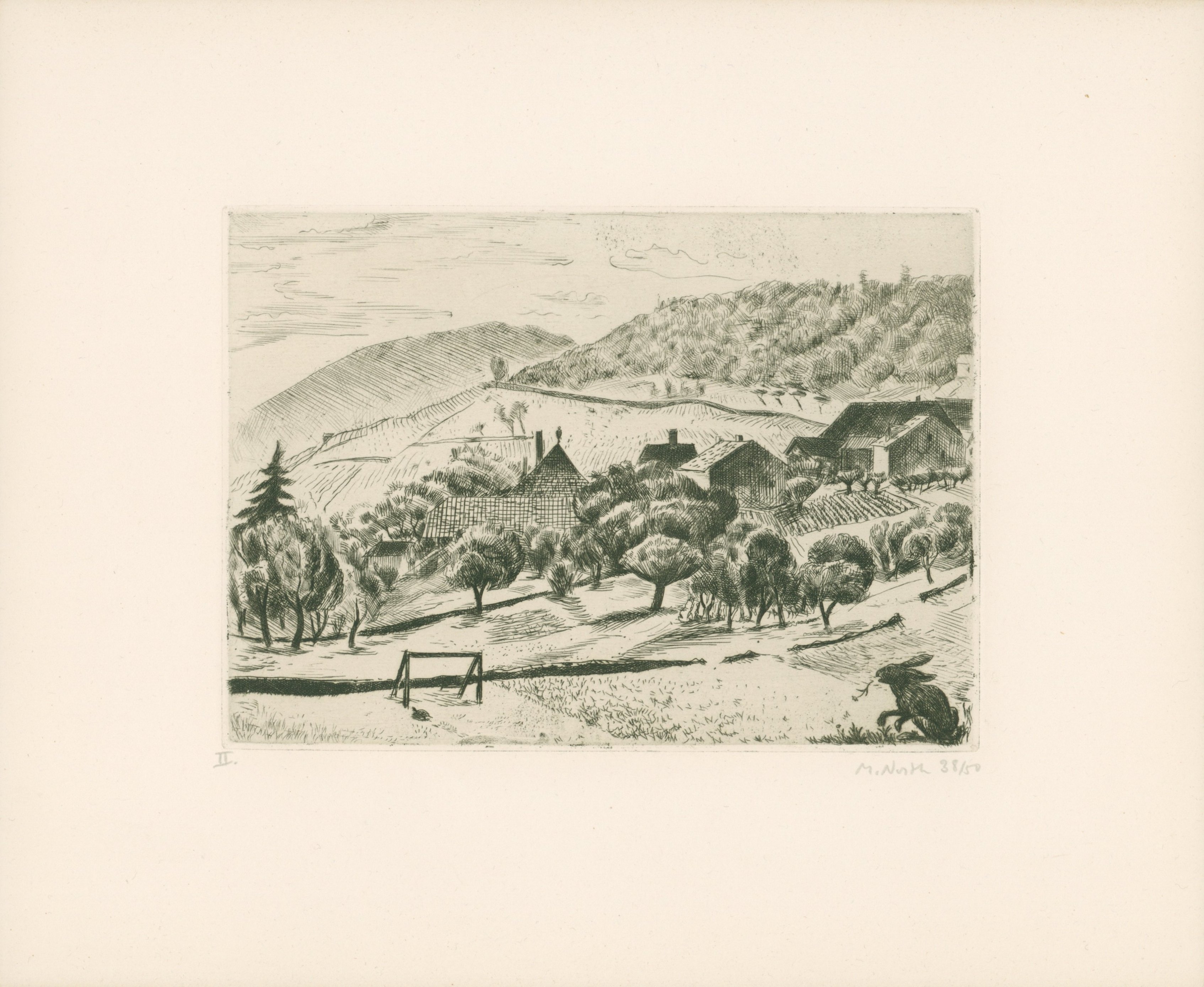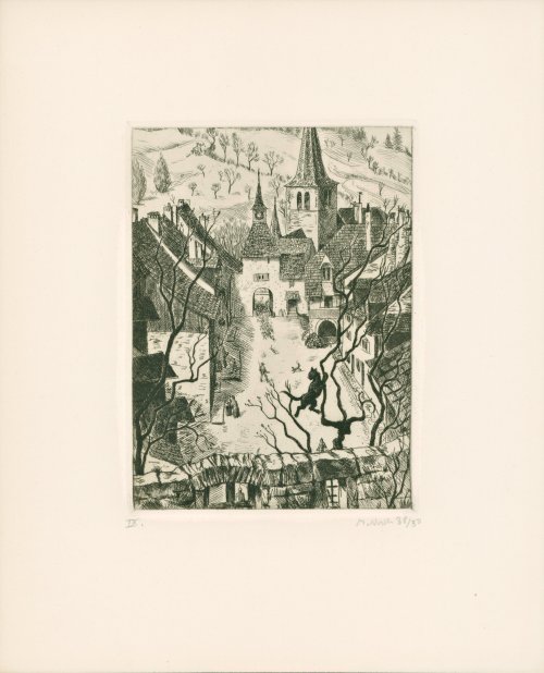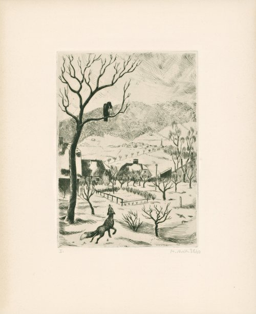 1941 "Paysages gravés à l'eau-forte pour douze fables de Jean de La Fontaine." "12 handwritten signed and numbered original etchings in loose sheets with tissue paper. In half-canvas folder. Number 38 of 50 copies. These etchings were printed at Orell Füssli in Zurich.